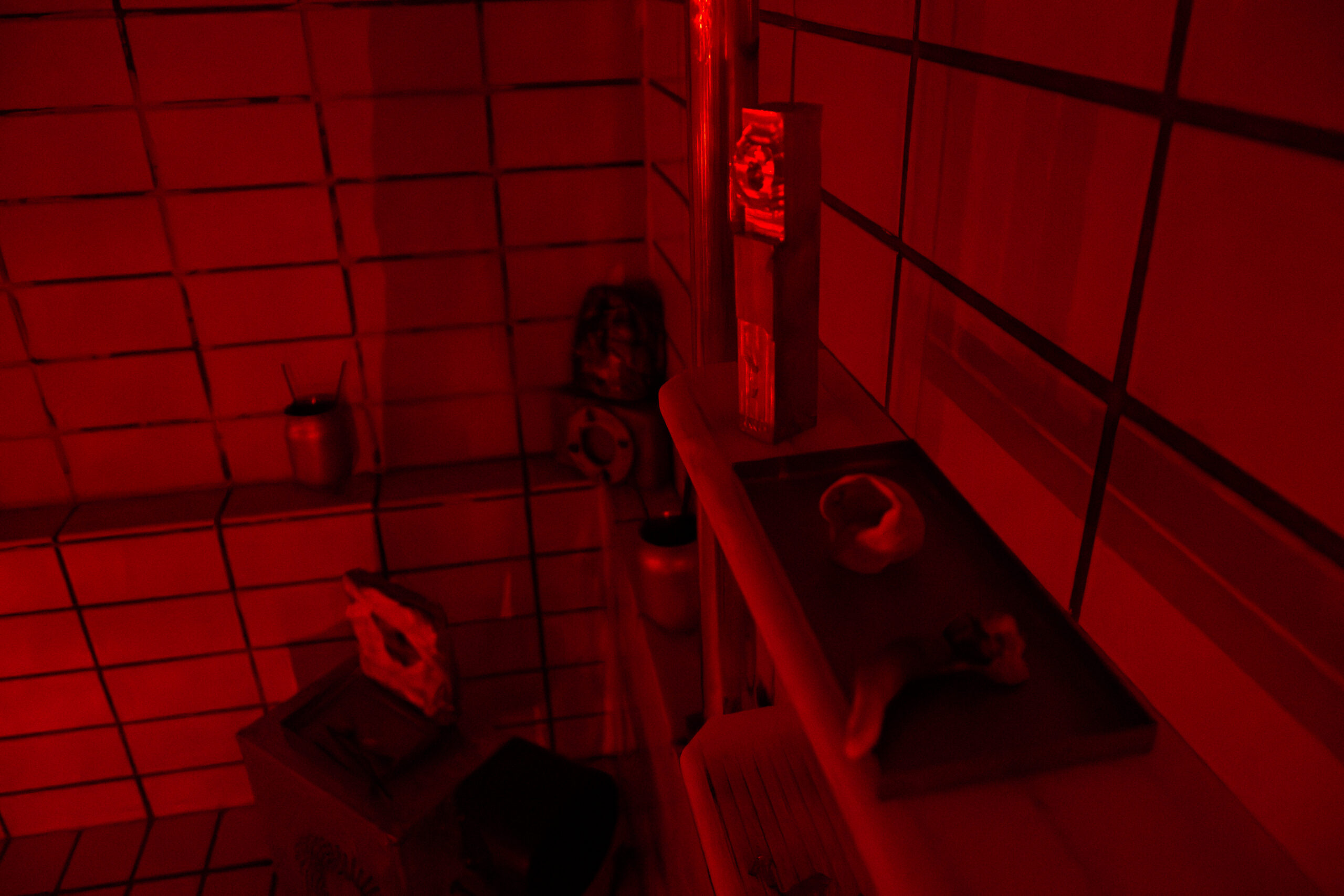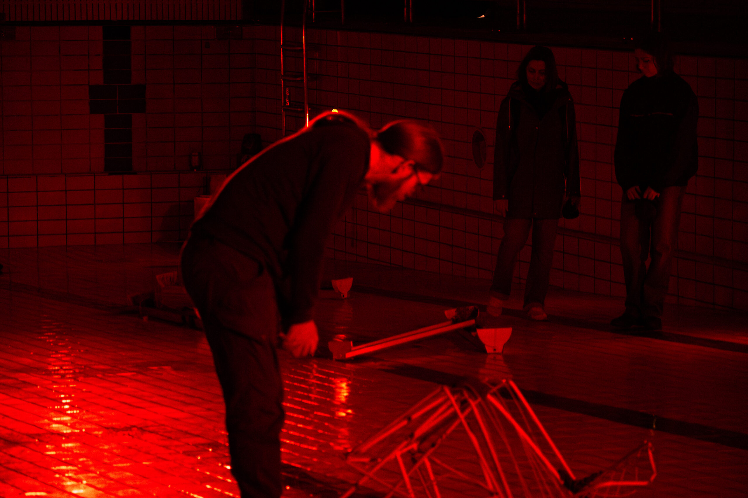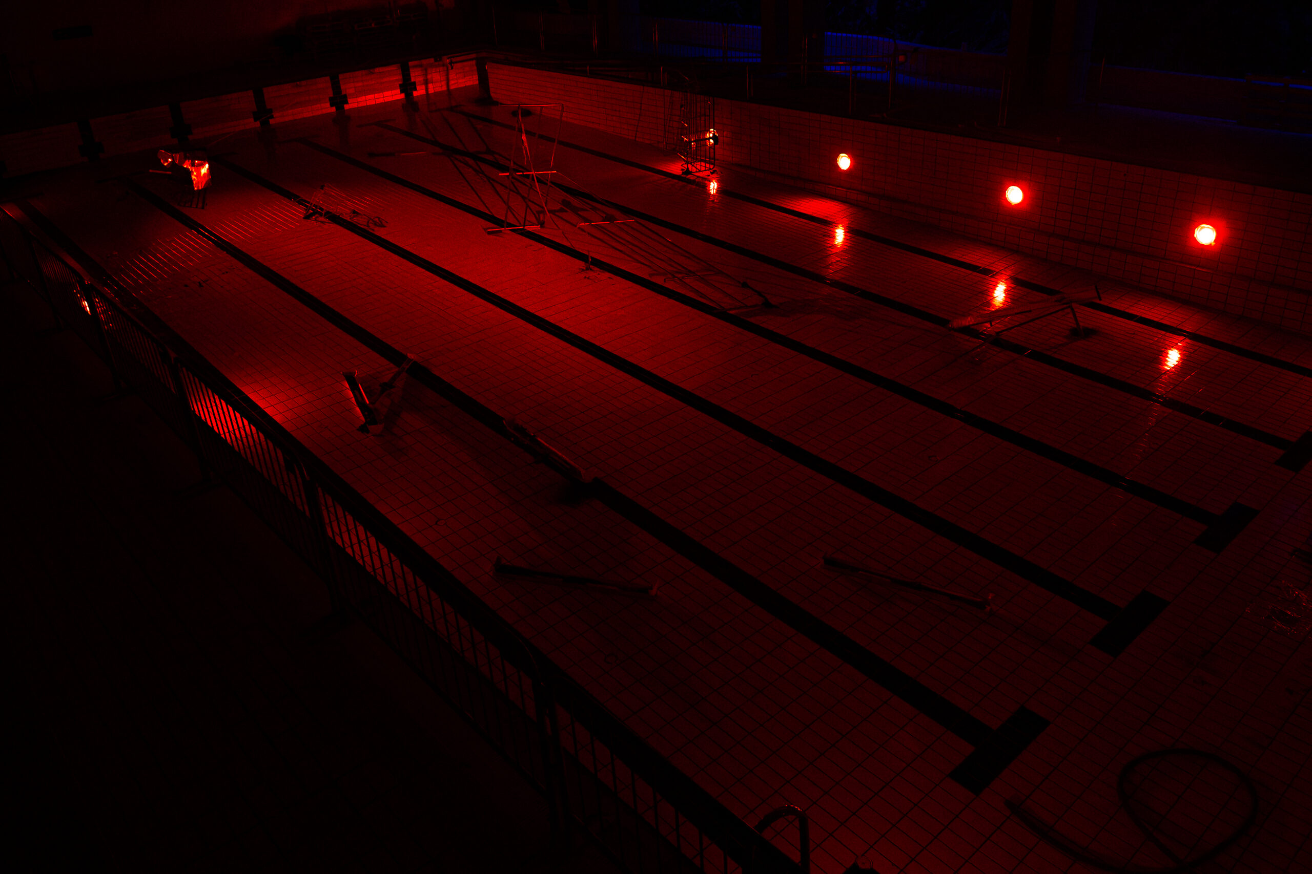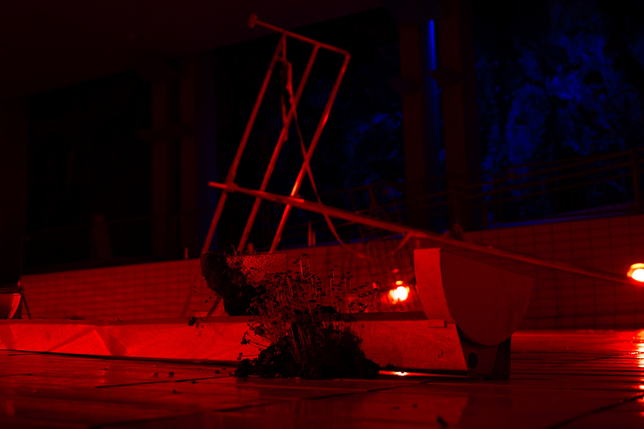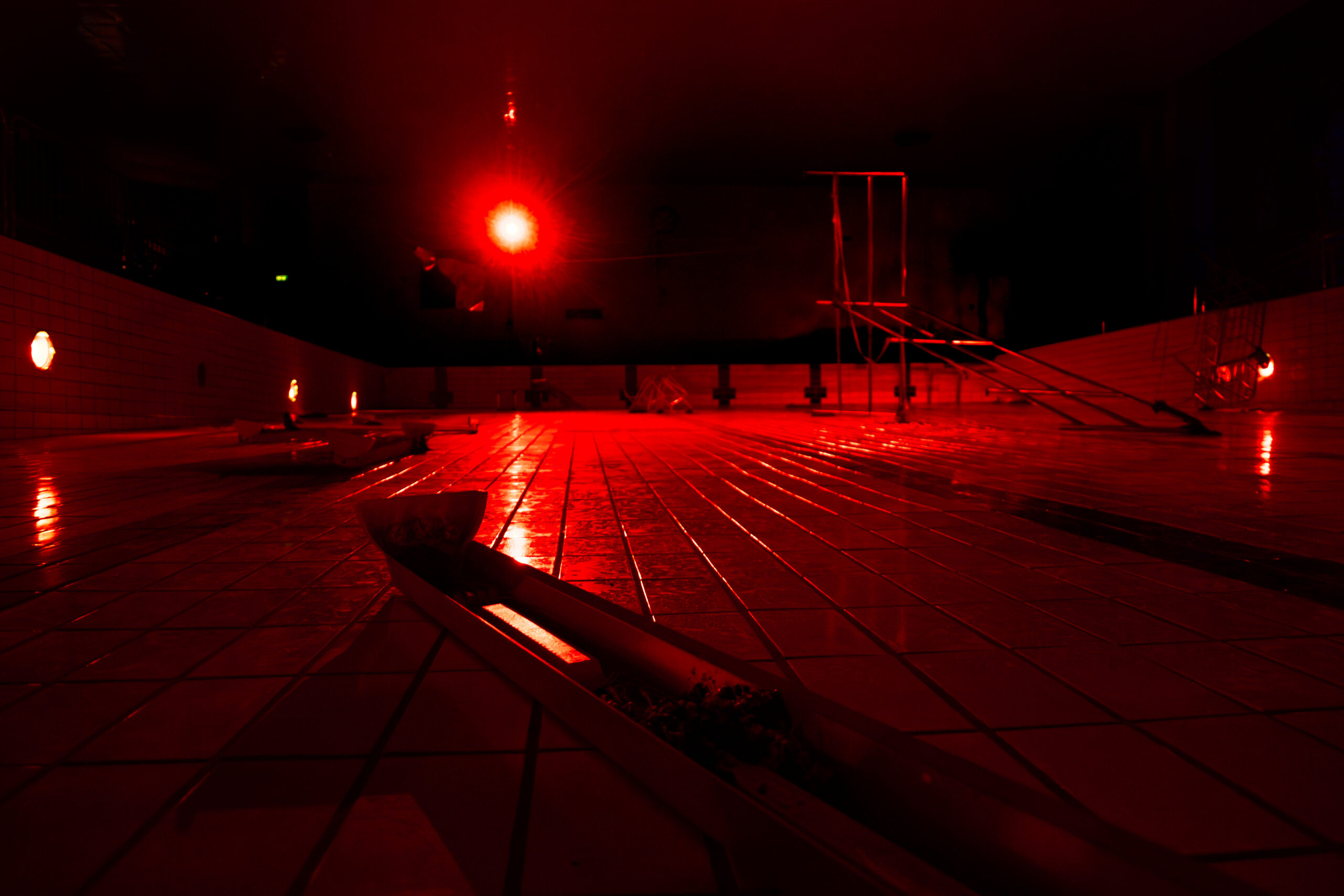 abandoned pool, metal railing, pool cart, light fixtures, copper plates, broken air purifier, wooden board with nails, various metal objects, dead mycelium, red filtered lamps, speakers, incense sticks.