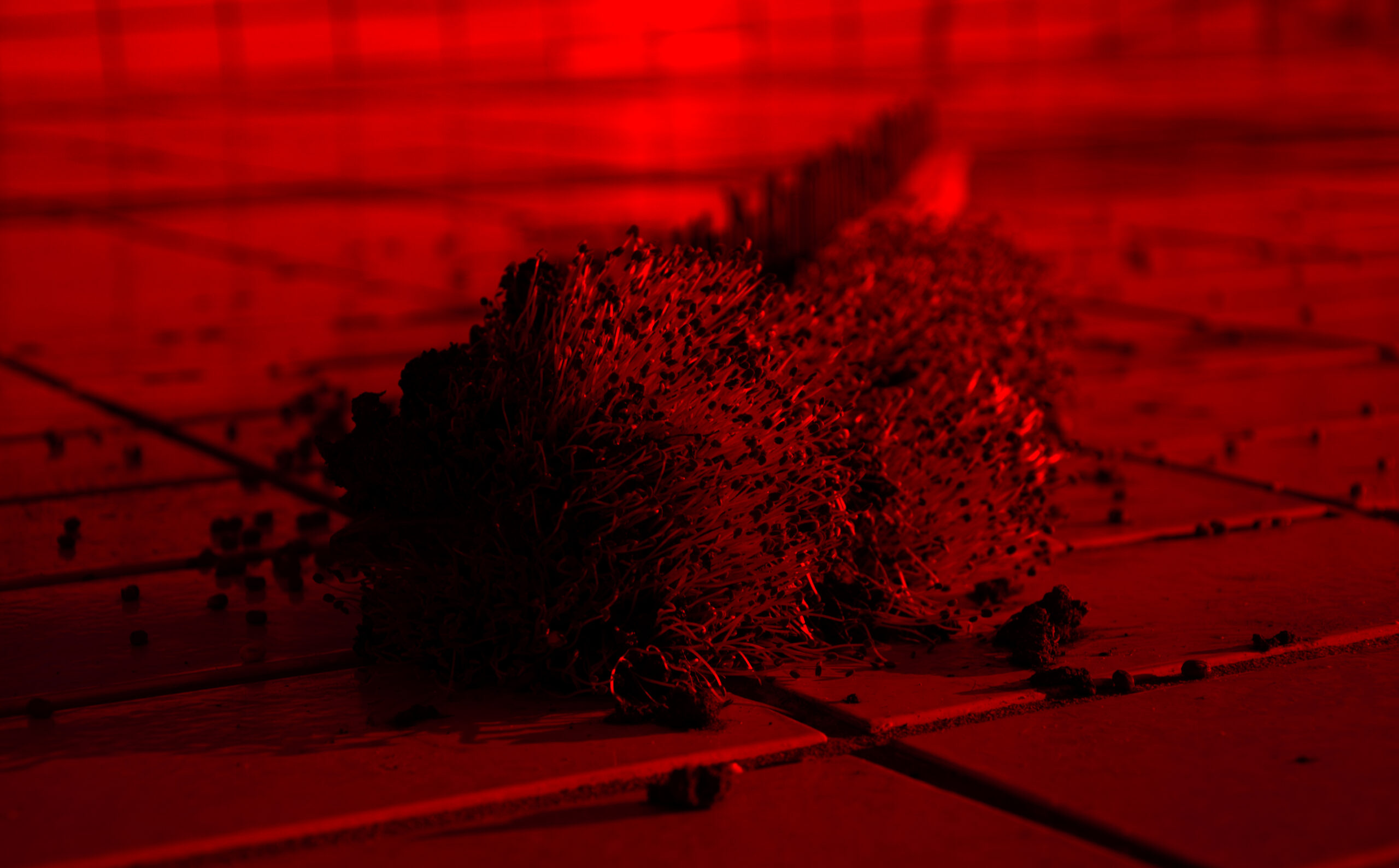 Due to the red lighting, the growing plants appeared white, pink, blood-red or, more rarely, black, depending on their variety and position in the space.