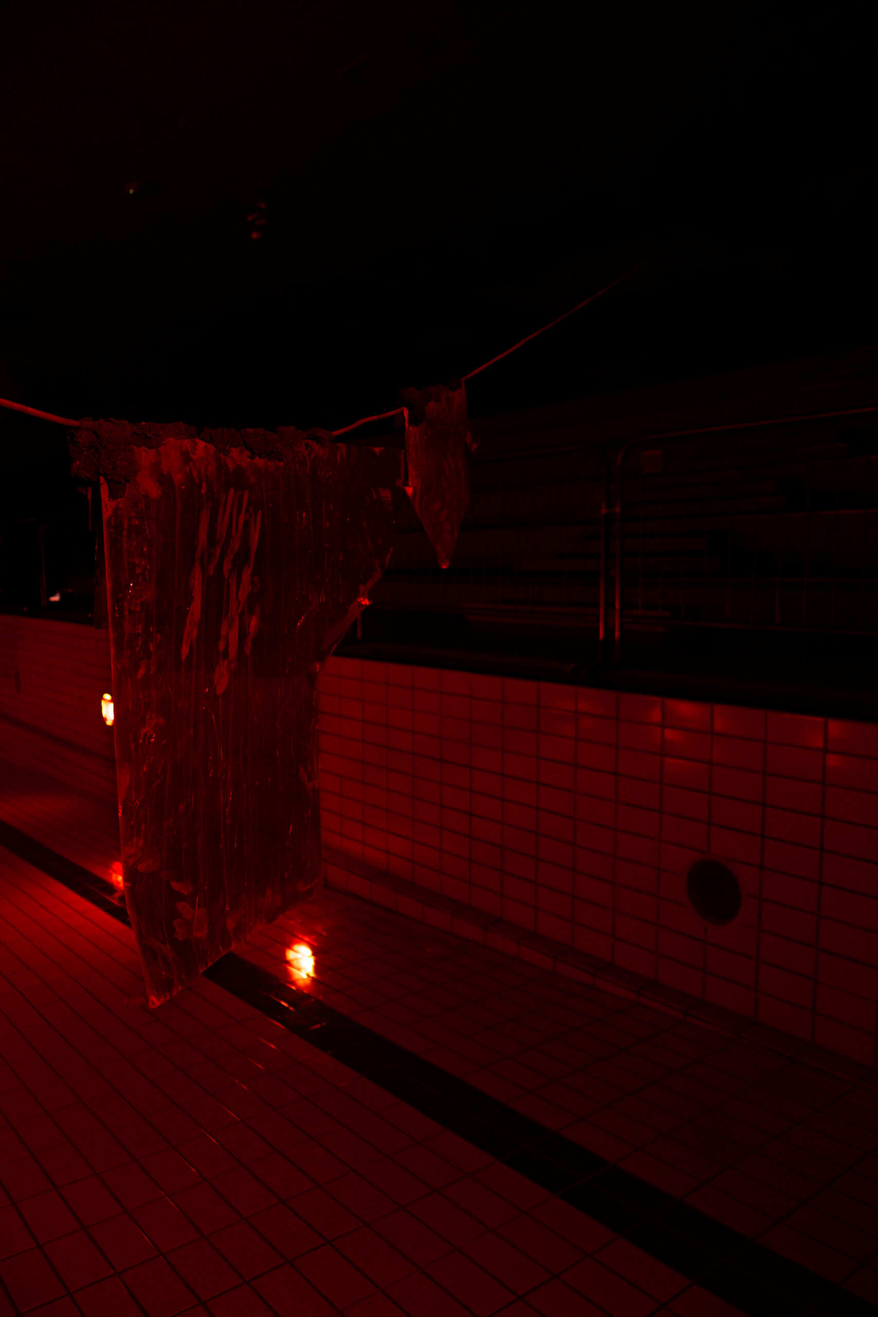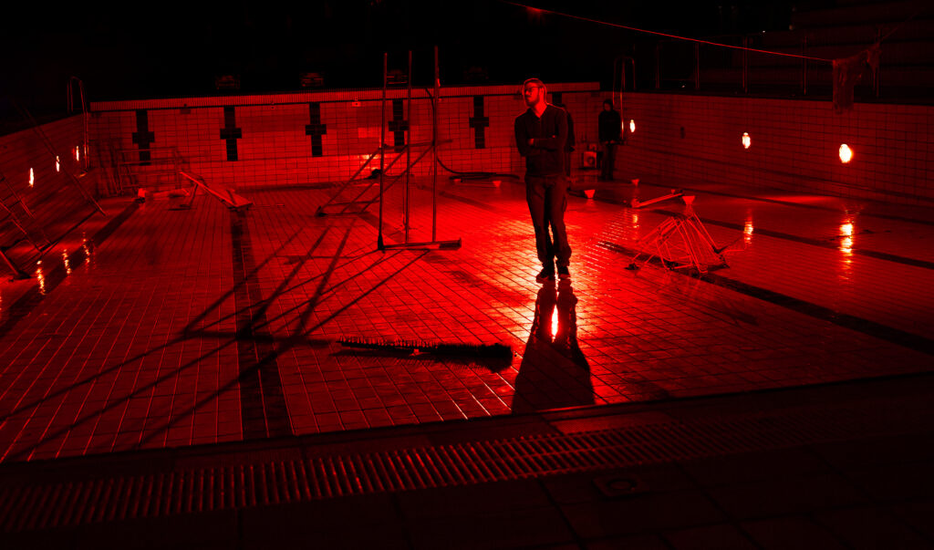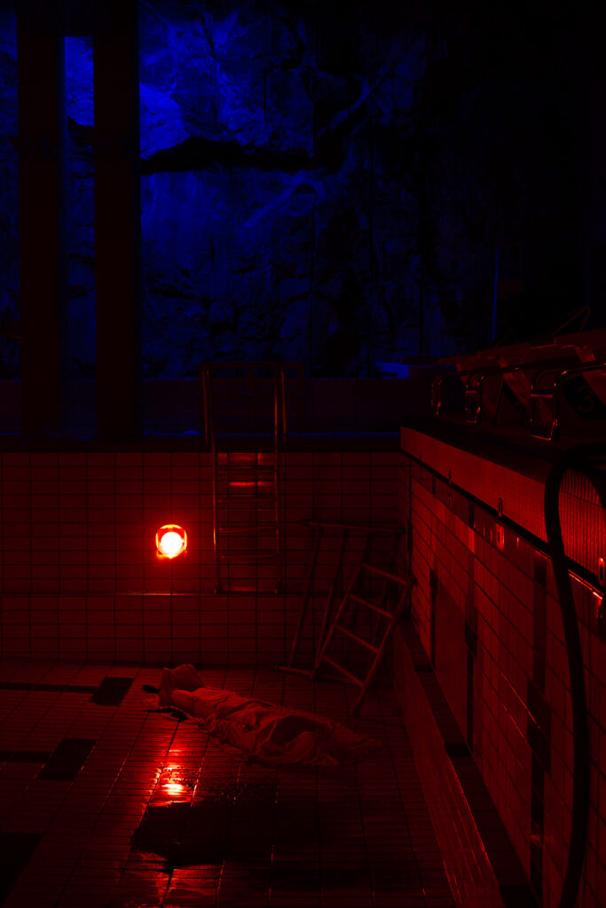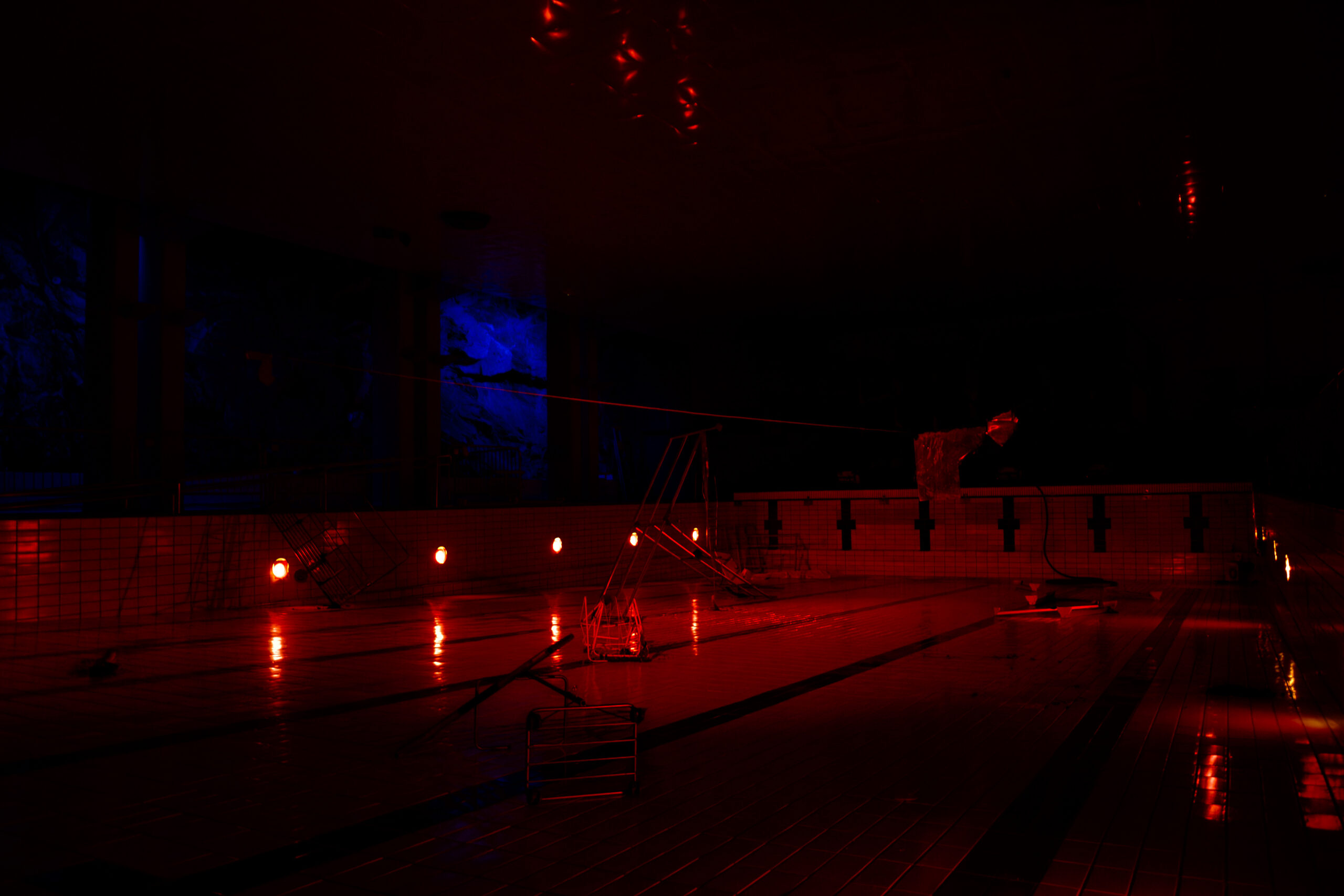 The space was lit only by red-filtered lights mounted low inside the pool and two elevated floodlights casting long shadows across the bottom of it. One side of the room was defined by an exposed stone hillside wall, illuminated with blue light. Rainwater seeped down its surface, producing a steady, resonant dripping sound that filled the space and blurred the boundary between interior and exterior.
