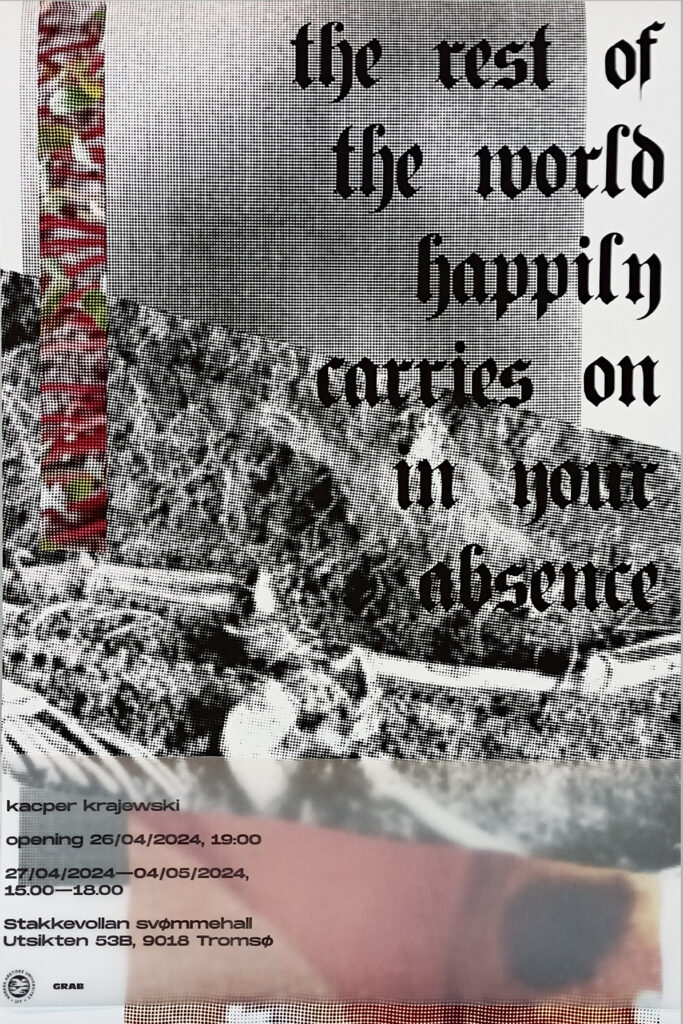 The exhibition took place inside an abandoned swimming pool in a 1970s residential complex in Tromsø. Utsikten Borettslag was originally conceived as a self-contained neighbourhood. It was supposed to be its own micro ecosystem, with its leading idea being becoming a place where you could, in theory, live your whole life without ever needing to leave the complex.