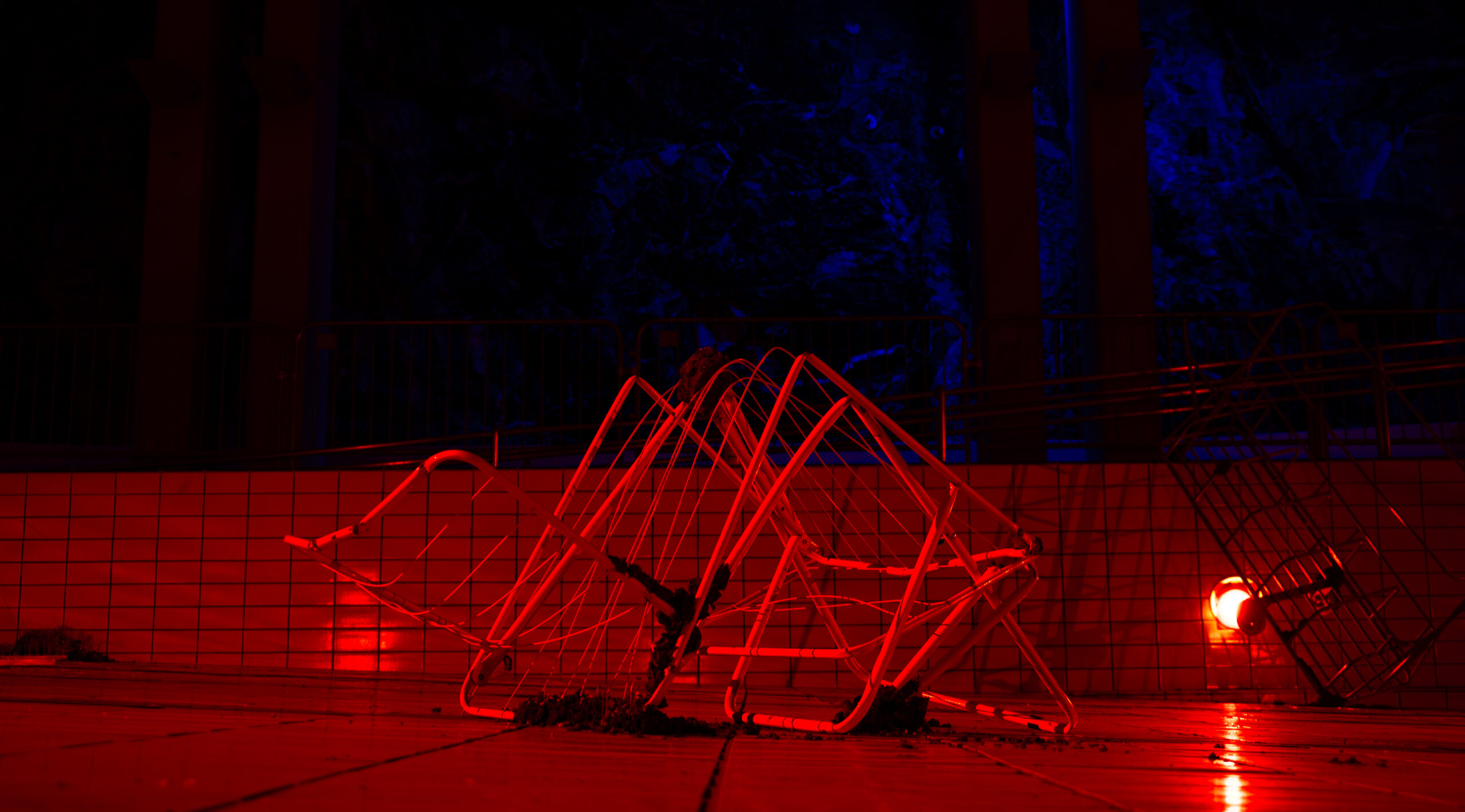 The pool basin contained a field of found objects, most of them sourced from the building itself: metal railings, pool equipment, light fixtures, carts, ventilation parts, scaffolding, and overflow drains… All of the objects had clear past functions, but were repositioned, damaged, or stripped of context to the point where their original purpose was no longer immediately legible.