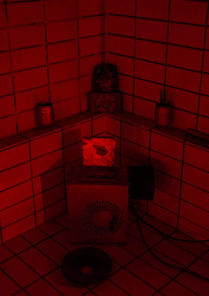 Nearby stood an altar-like structure assembled from a broken industrial ventilator, dead mycelium blocks, metallic fragments, and ritual remnants. Incense was burned regularly as part of a quiet, repetitive action. Visitors were invited to strike metal objects, producing resonant sounds that echoed through the basin.